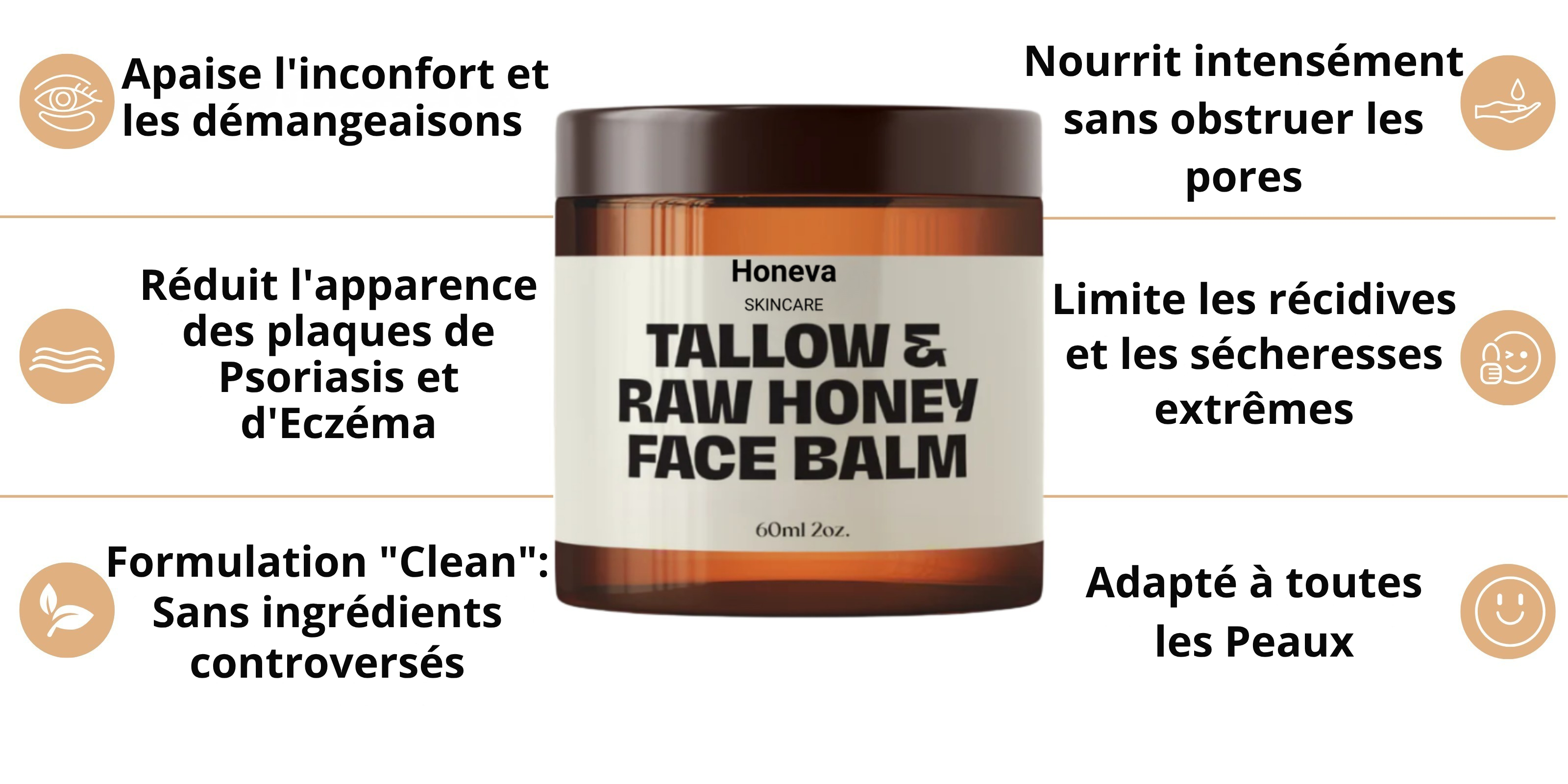 Des milliers de clients ont bénéficié d'une hydratation profonde et durable grâce à notre baume, trouvant un soulagement face à la sécheresse, l'acné, les irritations et la sensibilité. Notre mélange unique de tallow nourri à l'herbe et de miel cru imite le sébum naturellement produit par notre peau, apportant des nutriments essentiels qui apaisent, réparent et équilibrent sans obstruer les pores.